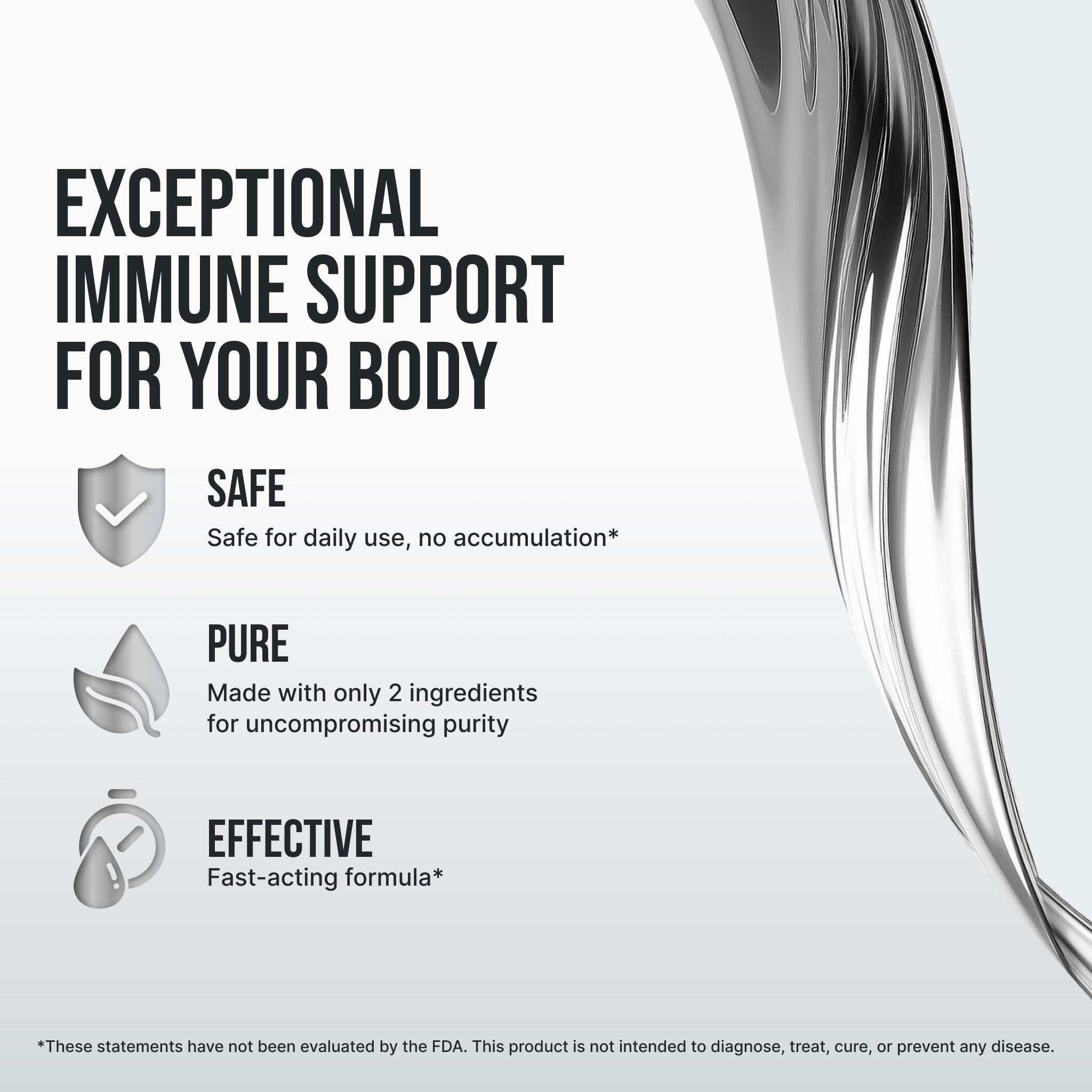 Crafted with only two ingredients: 99.999% pure silver and pharmaceutical-grade purified water. Simple, effective, no BS.